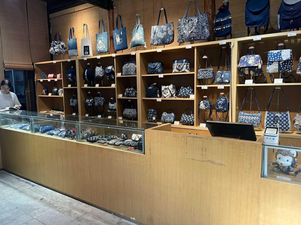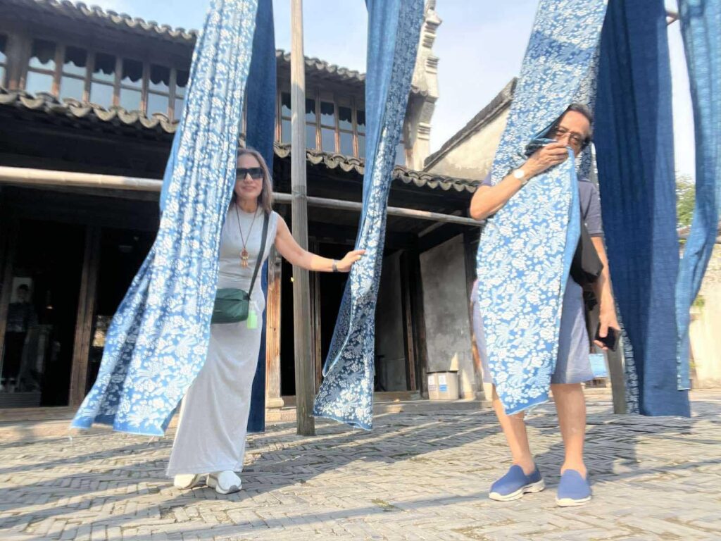 What spices up Wuzhen’s reputation as ancient, historical place is its specialty of traditionally handmade printed cloth known worldwide as “blue cloth.” It is a fabric created through sophisticated ancient techniques to produce intricate patterns on cotton cloth that ends up a versatile material for varied items such as tablecloths, curtains, and clothing, scarves, bags,  wallets, stuff toys, pouches, decorative items, you name it. This wonder fabric named as “blue cloth” pridefully hanged on high wooden poles so that tourists can appreciate its exceptional texture and quality. My wife and l were attracted to pose beside this hanged cloth flapping in the wind, and, like a gay appreciating the beauty and velvety touch of a lady handbag, l was enticed to do the same with the fluttering cloth, with the touch of àla true-blue gay.